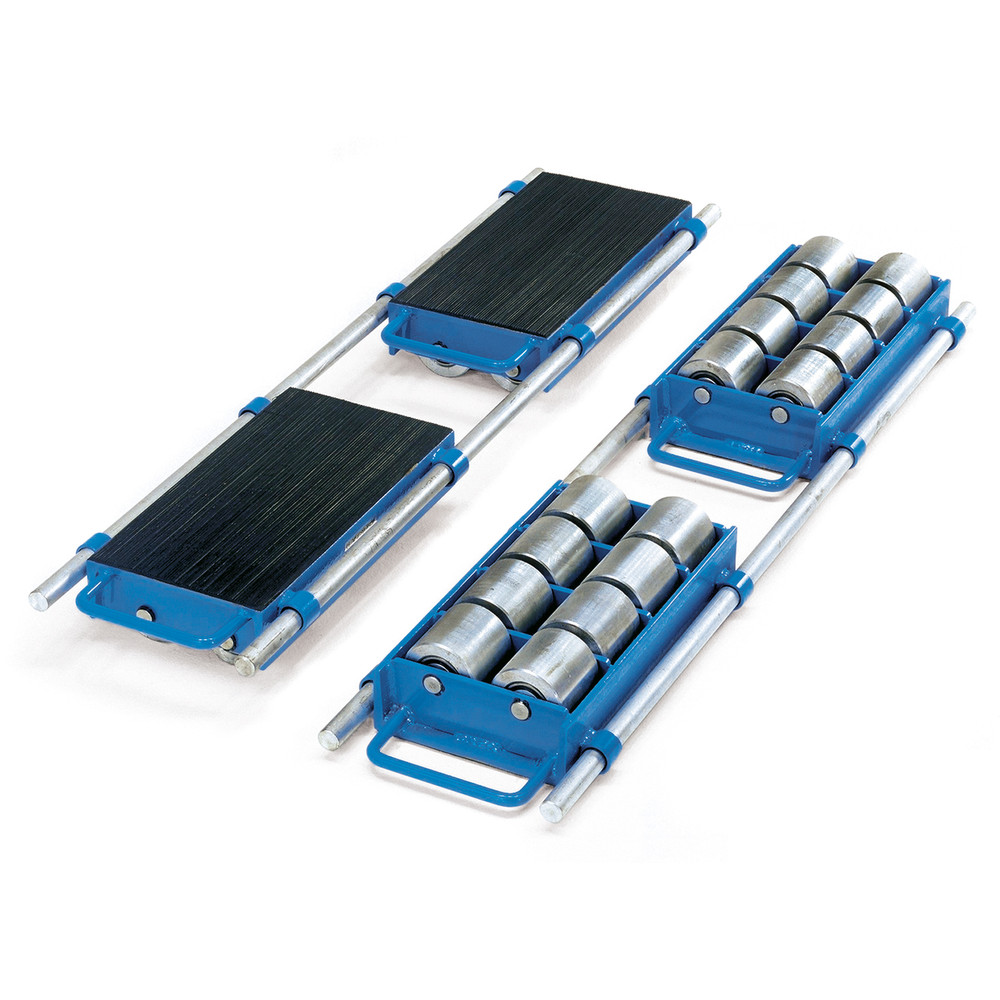 Onderstel voor eenvoudig en veilig transport van machines en andere zware voorwerpen. Stevige gelaste stalen constructie, met handgrepen van rond staal, poedercoating blauw RAL 5007. Steunplaten voorzien van antislip rubberen pads. Grote stalen wielen met kogellagers. Leveringsomvang: 2 transportwielen en 2 verbindingsstangen van rondstaal.
