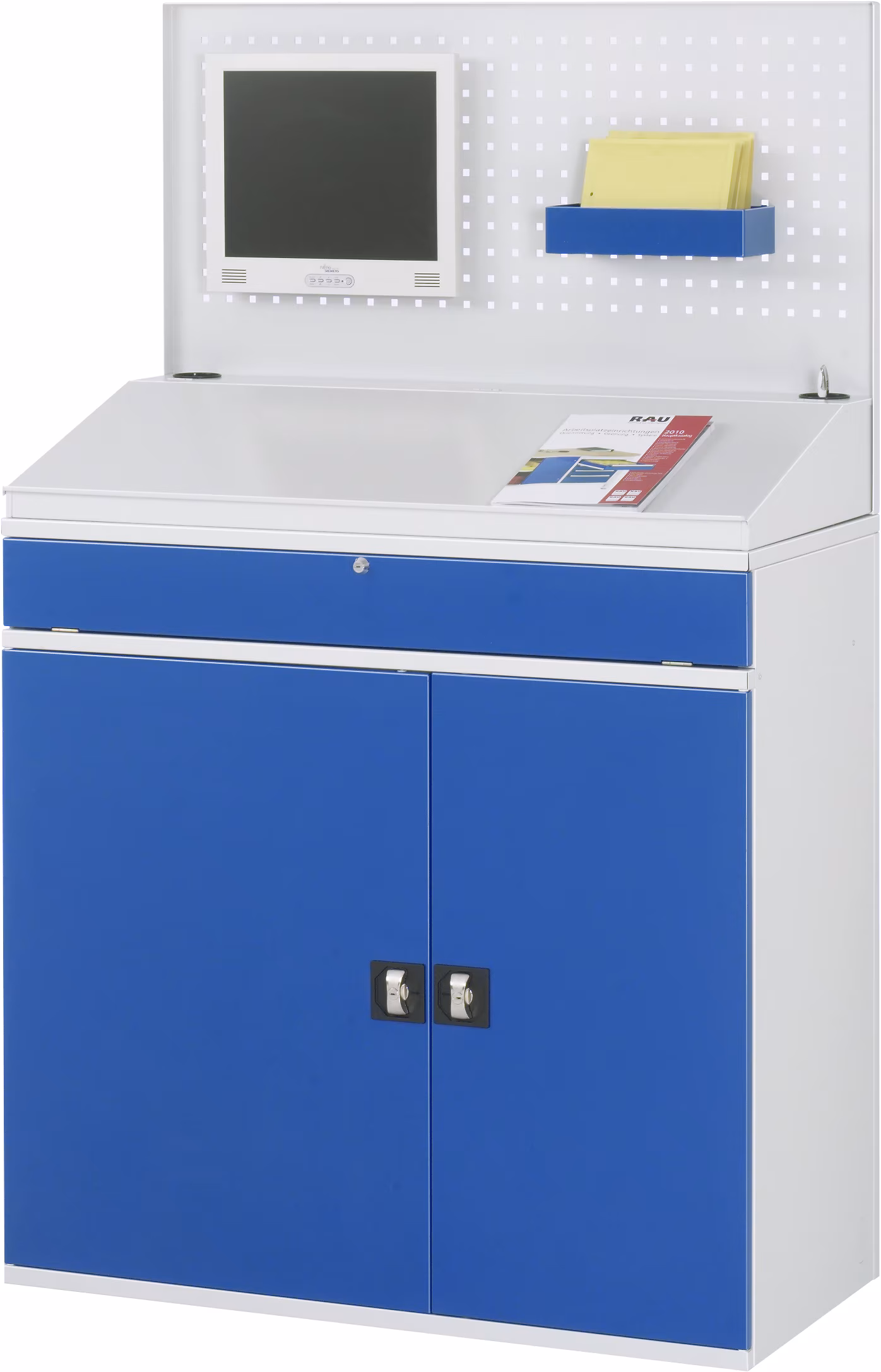 Geperforeerd achterpaneel met 2 boorpatronen (VESA MIS-D 75/100) voor montage van een flatscreen. Met vierkante systeemperforatie (perforatie 10x10 mm, hartafstand gaten 38 mm) voor montage van geperforeerde paneelaccessoires.Schrijfblad met scharnierend deksel (voorkant met aanslaglijst) en pennenbakje. Steunhoogte 400 mm. Onderkast onderverdeeld in afzonderlijk bruikbare en bedienbare compartimenten voor toetsenbord en draaideur. Kabelopeningen aan de achterkant van de kast, in het deksel en in het binnengedeelte. Toetsenbordcompartiment (hoogte 120 mm) met klep aan de voorkant (afsluitbaar) en toetsenbordlade. Toetsenbordlade B1020 x D450 mm voor toetsenbord- en muissteun (80 % uittrekbaar, draagvermogen 20 kg, vergrendelingspunt). Vak met vleugeldeur (hoogte 850 mm) met dubbele vleugeldeur (openingsbreedte ca. 100°, afsluitbaar), middensteun om de installatiebreedte te verdelen in 1x B650 mm (links) en 1x B450 mm (rechts) en met de volgende binnenindeling (installatiehoogte instelbaar): links: 1 x uitschuifbaar legbord B650 x D450 mm (uitschuifbaar 80 %, draagvermogen 20 kg, vergrendelpunt). 1 x interne lade B650 x D450 mm (100% uittrekbaar, draagvermogen 35 kg). rechts: 1 x uitschuifbaar legbord B450 x D450 mm (80% uittrekbaar, draagvermogen 20 kg, vergrendelpunt). 1 x interne lade B450 x D450 mm (100% uittrekbaar, draagvermogen 35 kg). Poedercoating Totaal draagvermogen max. 200 kg Volledig gemonteerd geleverd Kwaliteitsgarantie 5 jaar Made in Germany