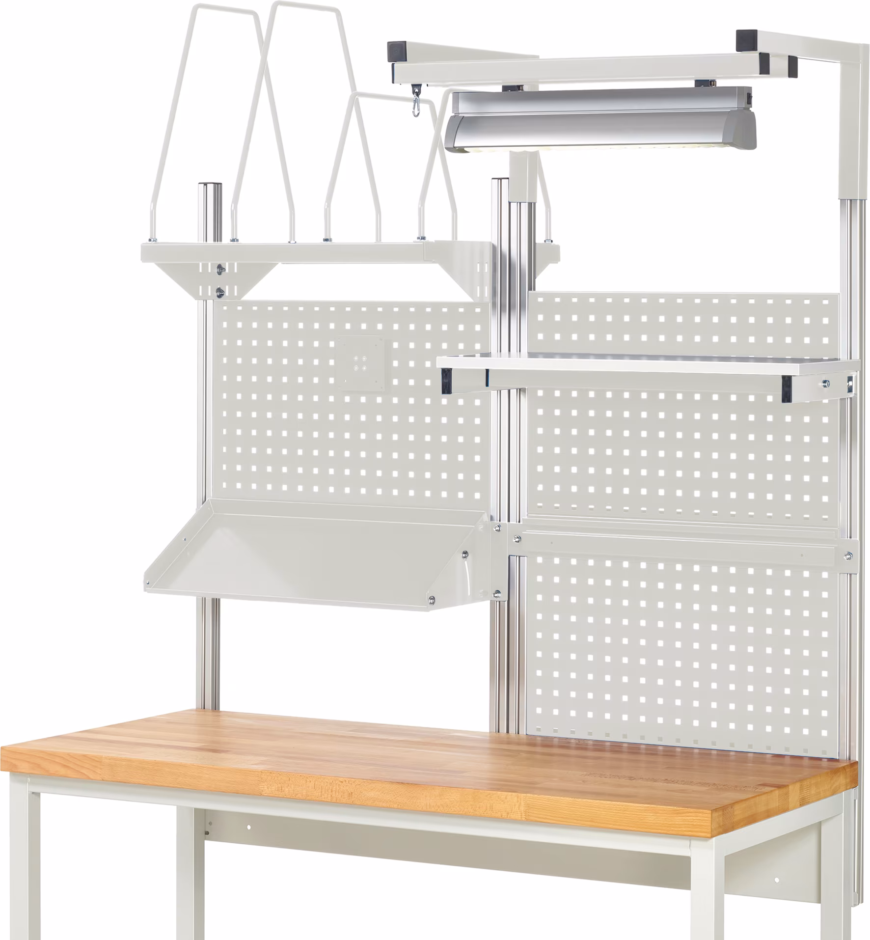 De bevestigingsset (dwarsbalk) wordt aan de achterkant onder het werkblad aan de systeemonderconstructie bevestigd. De 2 systeemdragers (aluminium profiel 40x40 mm) worden met schuifblokjes (in hoogte verstelbaar) aan de bevestigingsset (dwarsdrager) geschroefd en lopen achter het werkblad omhoog zodat de volledige diepte van het werkblad vrij blijft (geen schroeven aan het werkblad). De systeemsteunen hebben aan alle 4 zijden een profielgroef zodat ze aan alle zijden kunnen worden gebruikt.De 4 systeemsteunen worden links en rechts buiten en in het midden vastgeschroefd, zodat er 2 systeemvakken ontstaan met een systeembreedte van 750 mm. Bruikbare hoogte 1130 (vanaf bovenkant werkblad). Geschikt voor: Jerry en Tom serie werkbanken, 900 serie werkbanken, 8000 serie werkbanken, 7000 serie werkbanken, 8000 serie verrijdbare werkbanken, 8000 serie werkbanken met verrijdbaar onderstel, 7000 serie ladekasten, 7000 serie montagewagens, adlatus 300 en 600 serie elektrisch in hoogte verstelbare werkplekken. Montage op: Systeemonderconstructie. Montage van: Bevestigingselementen (systeemtoebehoren). 1 x montageset (traverse) met 4 systeemdragers (resulteert in systeembreedte 2x750 mm). 3 x geperforeerd paneel B665 x H450 mm. Met vierkante systeemperforatie (perforatie 10x10 mm, afstand hart gat-midden 38 mm) voor de opname van geperforeerde paneeltoebehoren. 1 x kantelbaar metalen legbord B665 x D300 mm; aan alle zijden opstaande randen. 1 x Steunrail B665 mm voor de opname van magazijnbakken met open voorzijde (open ophangrand vereist aan de achterzijde van de magazijnbakken met open voorzijde) en/of energiebalk. 1 x Kartonnen boxmagazijn B665 x D600 mm; paneel met melamineharscoating met bevestigingsbeugels en C-profiel bevestigd aan de voor- en achterzijde voor variabele positionering van de insteekbeugels met behulp van systeembouten. Insteekbeugels 2 x H300 mm en 2 x H500 mm. Positionering tussen de systeemdragers met schuifmogelijkheid +/- 125 mm op de montagebeugels. 1 x flatscreenhouder met montageadapter voor geperforeerde plaat (VESA MIS-D 75/100). 1 x legbord B750 x D300 mm; plaat met melamineharscoating. 1 x paar x paar beugels D550 x H300 mm voor bevestiging van rail/ montagerail (max. 2 stuks). 2 x rail/ montagerail B750 mm voor bevestiging van verlichtingsstrip en/of trolley met karabijnhaak. 1 x trolley met karabijnhaak voor bevestiging van veerbalans, balancer, etc. 1 x lineaire verlichting (lichtbehuizing van aluminium). Geïntegreerde elektronische LED-omzetter. Aan/uit-schakelaar, aansluitkabel met stekker. Lichtkleur neutraal wit kleurtemperatuur 4000 Kelvin (840). Vermogen armatuur 10 watt. Lichtstroom 1323 lumen. Armatuurefficiëntie 132 lm/W. CE-markering. Beschermingsklasse IP20. Nominale levensduur: omgevingstemperatuur -20° tot +40°, LED componenten L80B50 > 50.000 uur. Installatiehoogte van de aanbouwelementen kan worden aangepast binnen de systeemdragers. Totaal draagvermogen max. 100 kg Draagvermogen max. 30 kg per aanbouwelement Gedeeltelijk gemonteerd geleverd Poedercoating Kwaliteitsgarantie 5 jaar Made in Germany